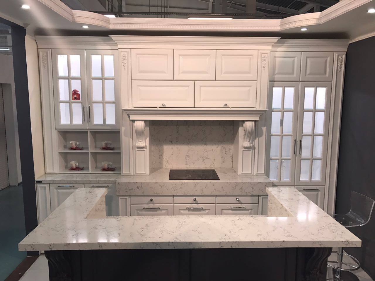 Столешница и остров выполнены из кварцевого камня Silestone - White Arabesque.