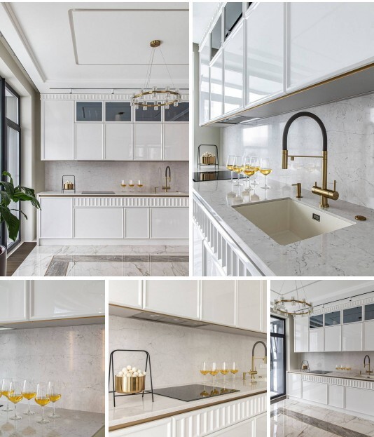 Кухня дополнена столешницей из кварцевого камня Silestone в цвете Pearl Jasmin.