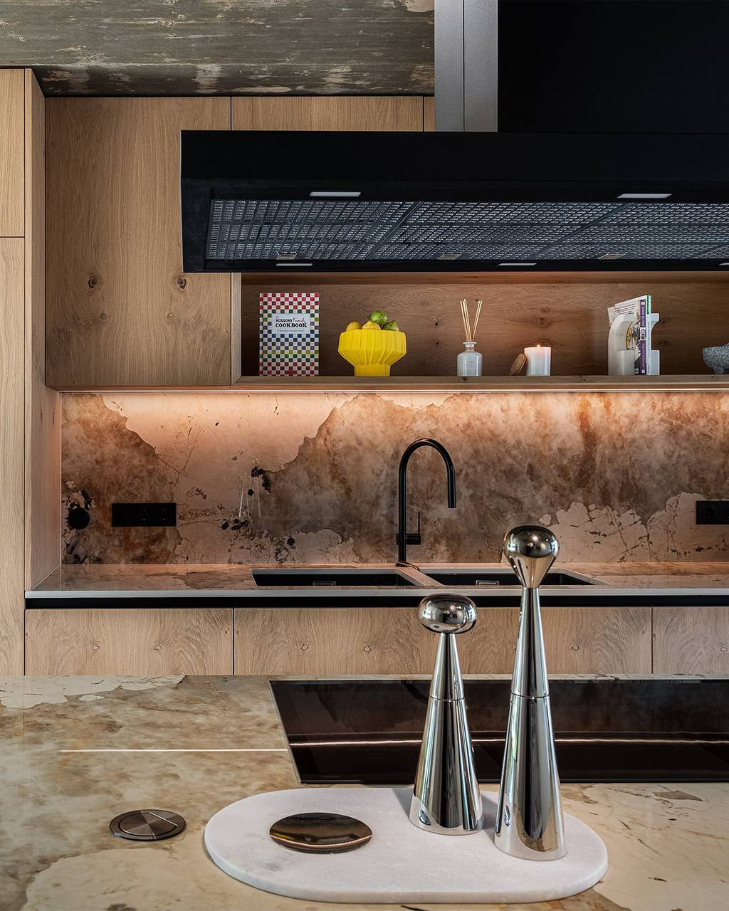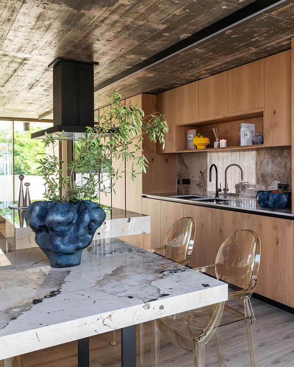 На эффектной кухне Dekton Khalo плавно переходит от кухонного фартука к острову и столешнице.
