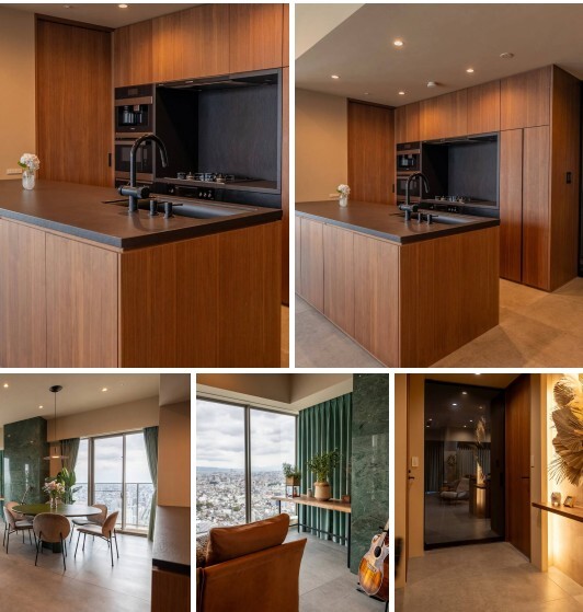 В этой образцовой комнате жилого дома, из окон которого открывается панорамный вид, для кухонной столешницы была использована каменная керамика Dekton в цвете Sirius, а для пола — Dekton Kreta.