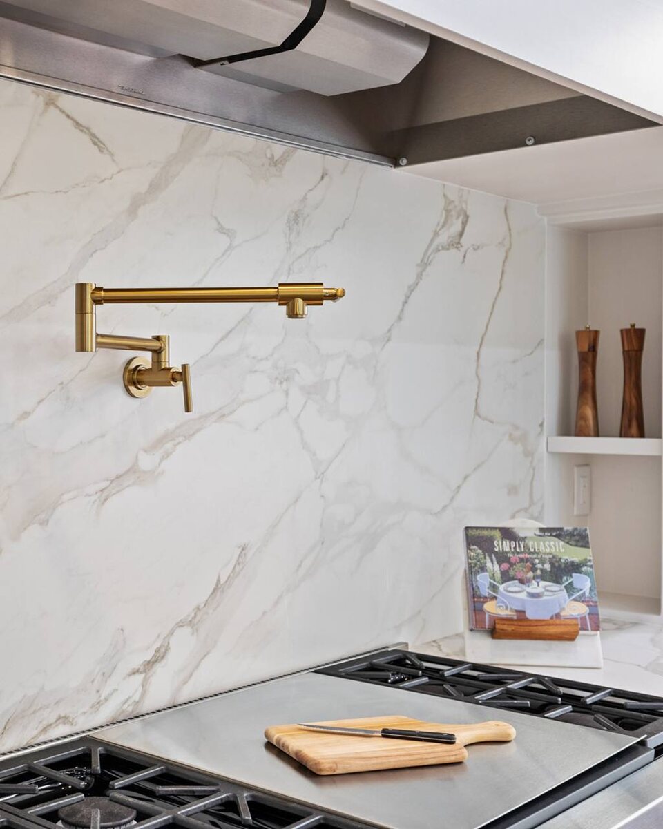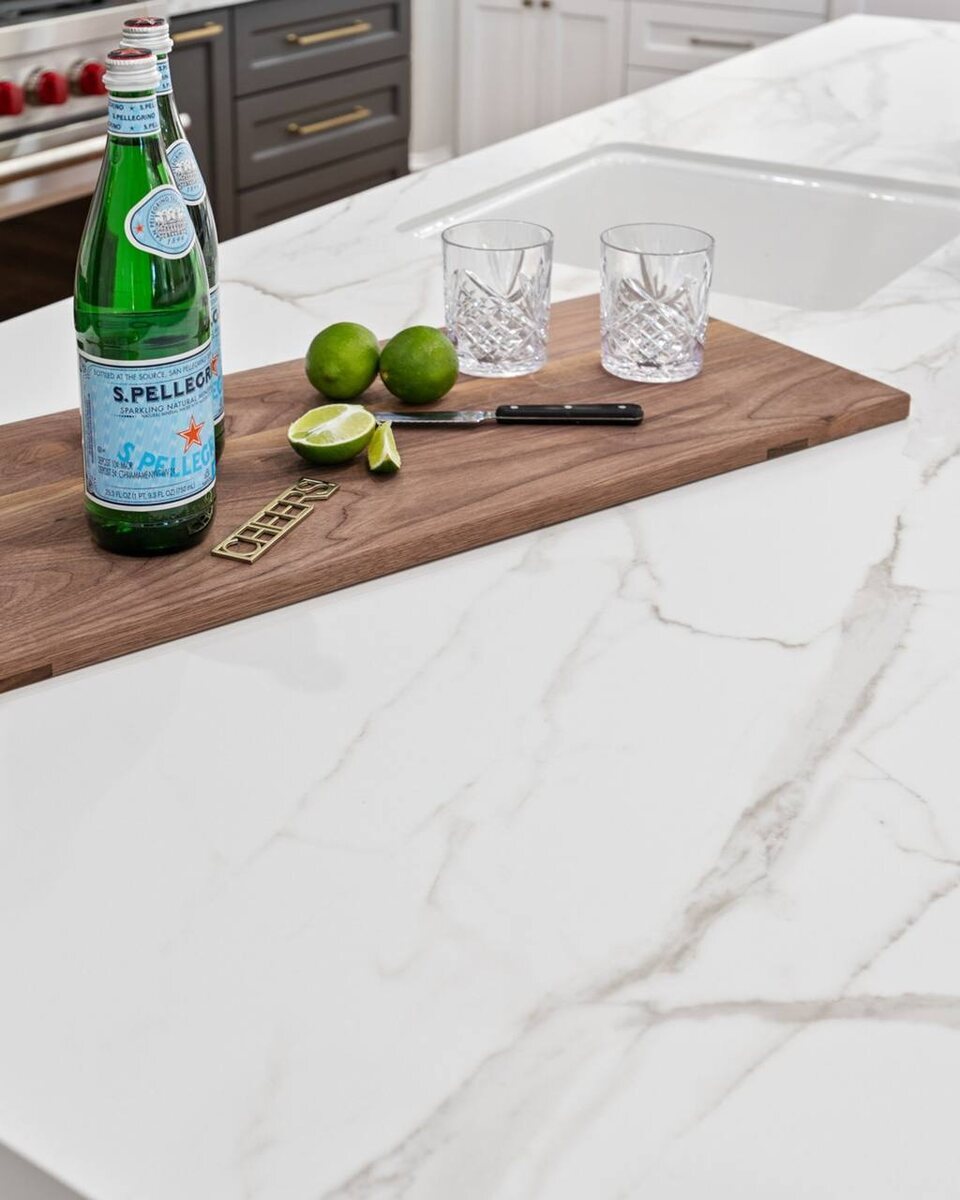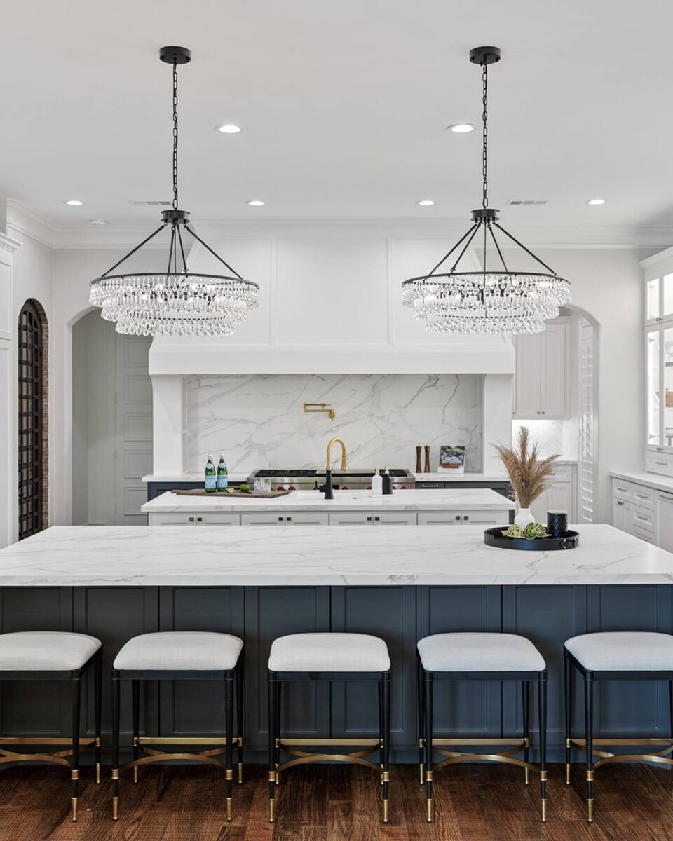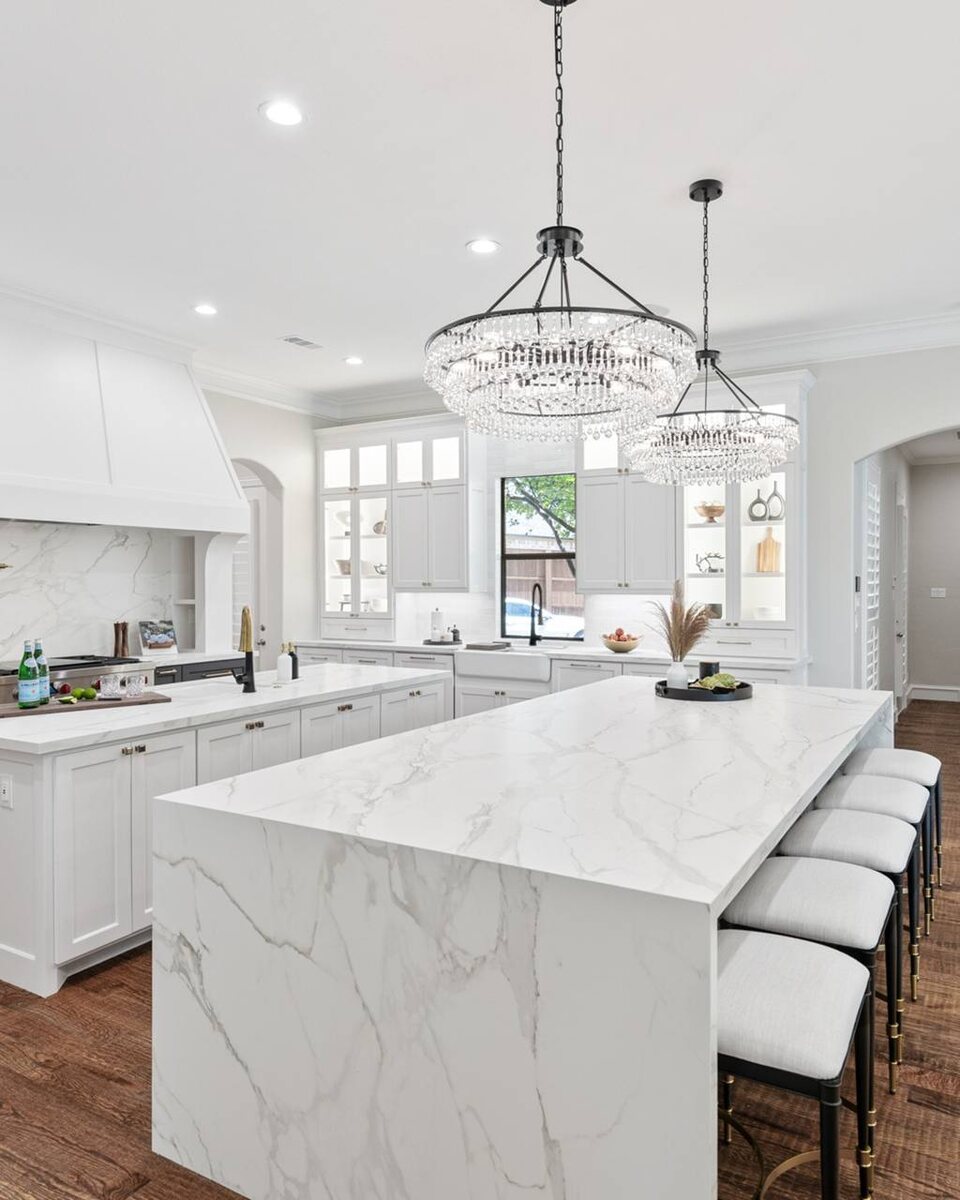 Из него выполнены все столешницы, стеновая панель и огромный остров.